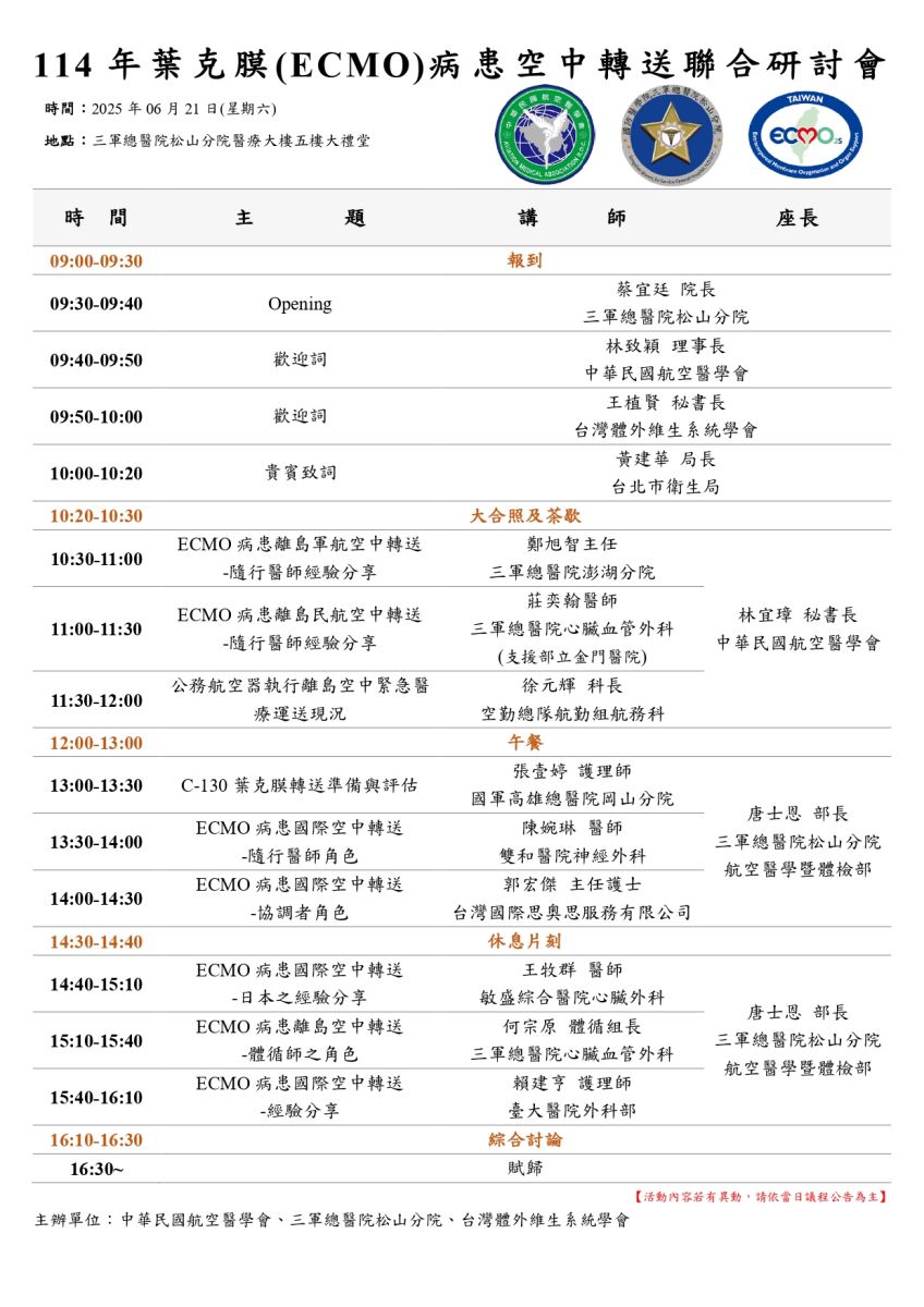 主辦單位:中華民國航空醫學會、台灣體外維生系統學會、三軍總醫院松山分院